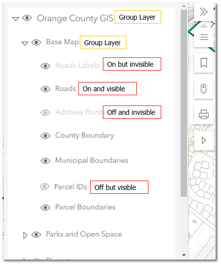 The Layers button provides access to a list of present layers that can be turned on/off. A layer can be turned on and off at any time, but it might not always be visible depending on the zoom level. Invisible layers are grayed out but will change when the appropriate zoom level is reached. Turn each layer of by hitting the visibility icon (the eye) to the left of each layer. Also, entire groups of layers can be turned toggled on/off (for example, the Base Map layer is actually a group of layers), all of which can be activated/deactivated by hitting the Base Map layer's eye.
