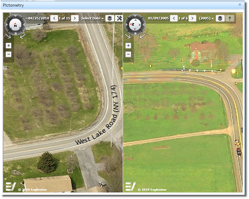 This tool provides the ability view the aerial imagery of the map in an oblique (or "bird's eye") view and enables the viewer to see at different angles or perspective. Pictometry is equipped with the means to view imagery of different dates and export as a pdf. It also has the means to view a point from two independently configurable frames.