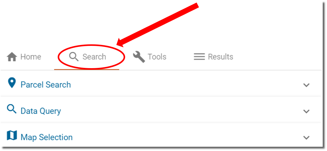The search tab contains specialized searching functionality, such as searching parcel data based on criteria and searching for a feature by attributes and geometry. There are three primary tools available in this tab: Parcel Search, Data Query, and Map Selection.