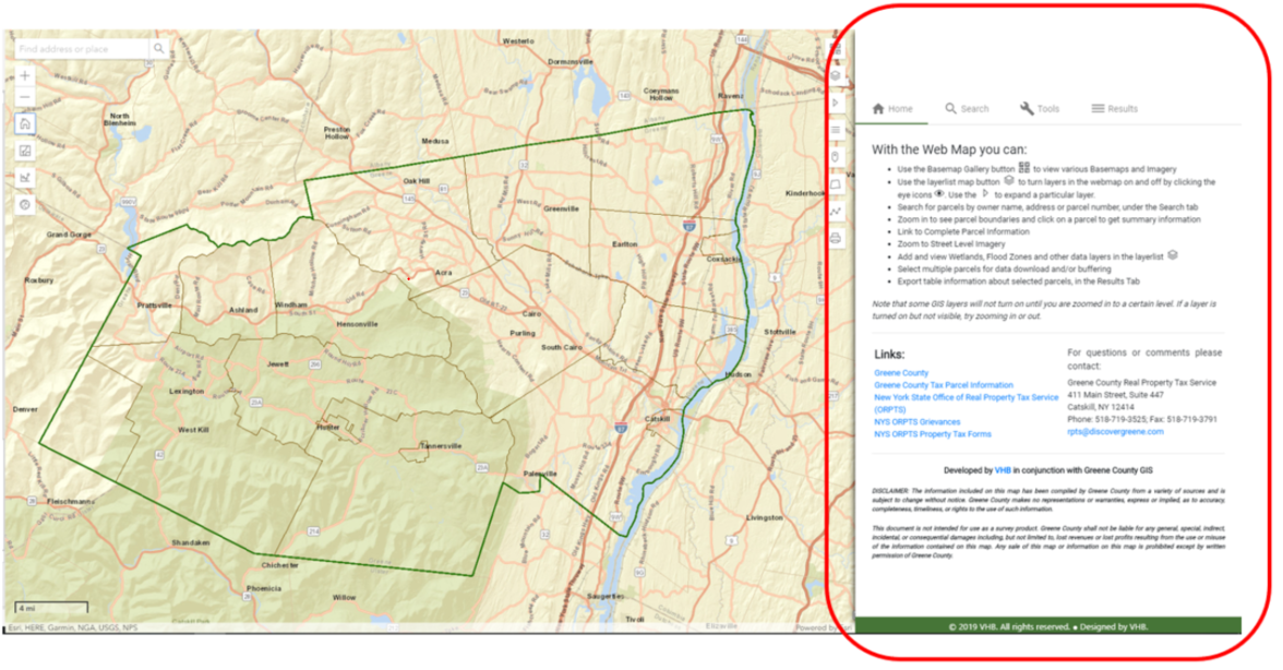 Upon opening the web app, two frames will be visible: the map (to the left) and the contents panel (to the right). This is where the tools are found to help explore the data available on the map. It has 4 primary tabs (Home, Search, Tools, and Results) which are explained in this help document. Displayed here is the Home tab, visible when the app opens.